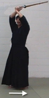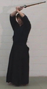Every time we strike a men, our hands go back above our head. Some people start haya-suburi from the migi-jodan position (hands above the head). And others start it from chudan. The former is introduced here.